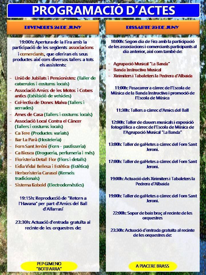 Dissabte de matí i vesprada hi ha passacarrers musicals, tallers de galetes, de ball, de clauers musicals, una exposició fotogràfica, l’actuació dels Xirimiters i Tabaleters la Pedrera d’Albaida, i un sopar de baix braç al recinte on es farà l’actuació d’A Piacere Brass.