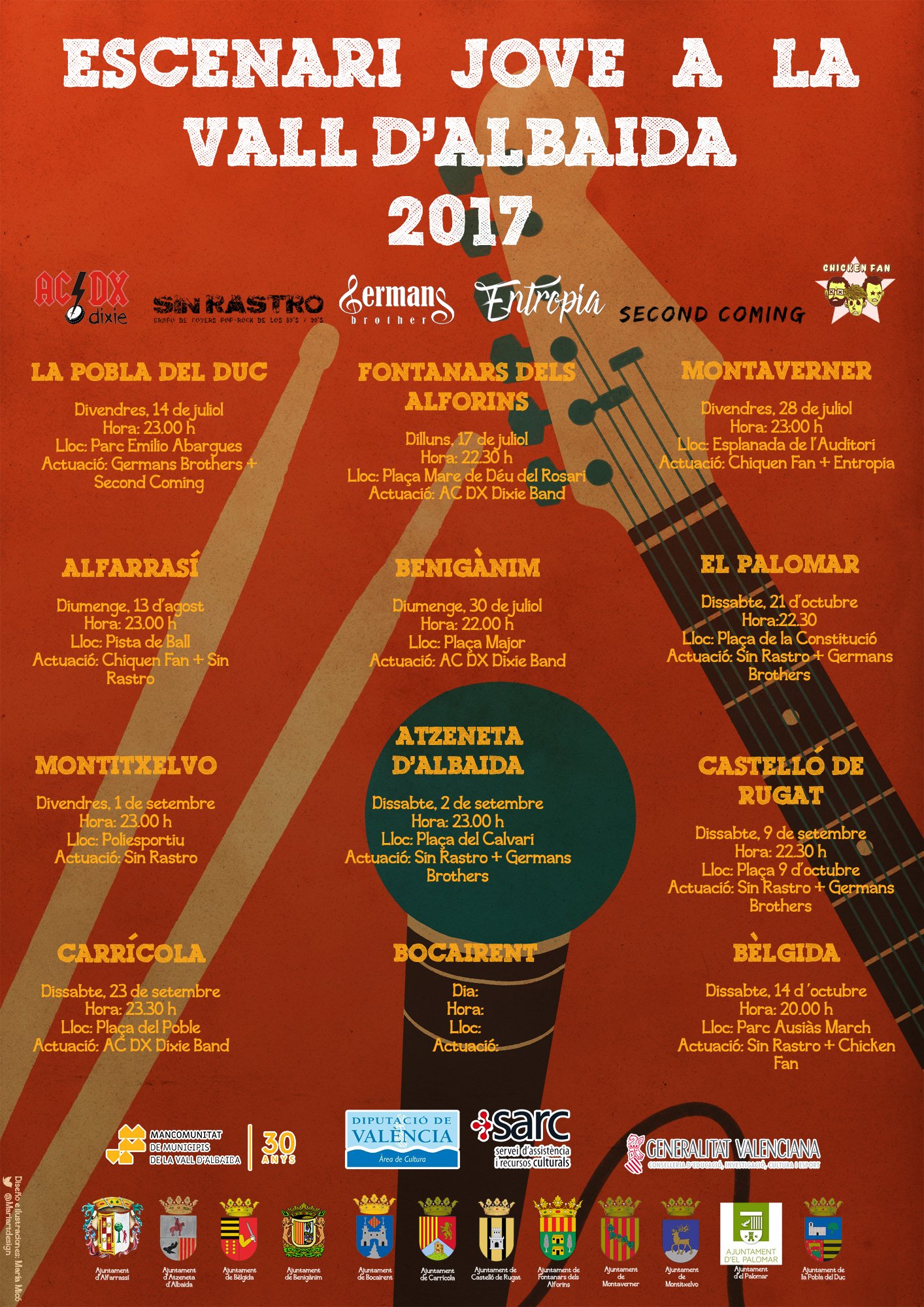 Els Sis grups que participaran en aquesta primera edició de l’Escenari Jove de la Vall d’Albaida són Germans Brothers, Sin Rastro, Second Coming, AC/DX DixieBand, Chicken Fan, i Entropia.